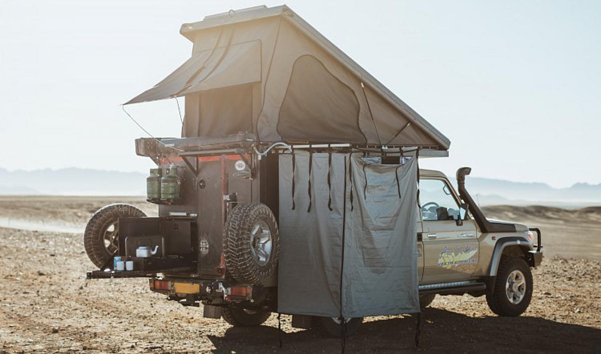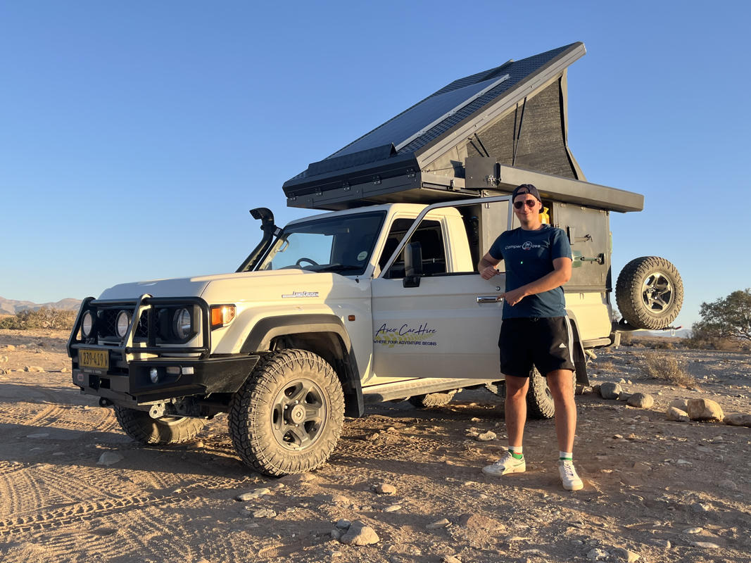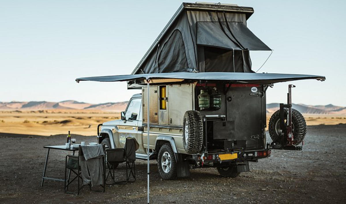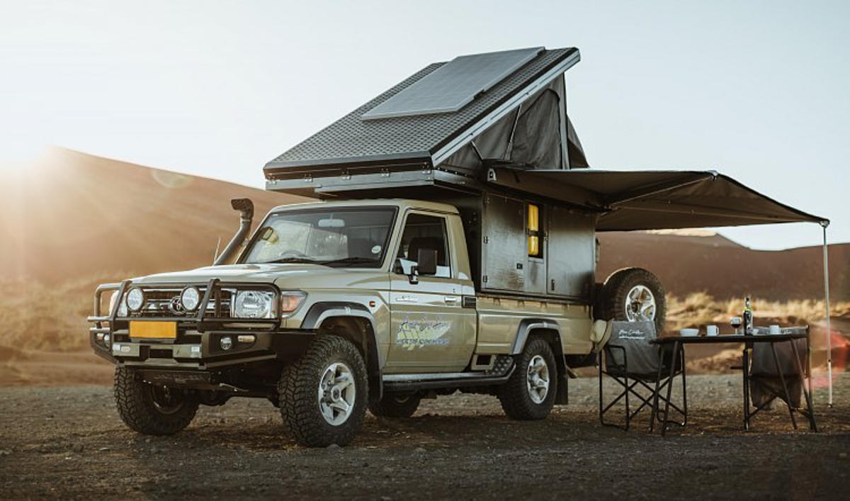 Der Group L Toyota Landcruiser 4x4 SC 2.8 Auto von Asco Car Hire ist ein Premium Fahrzeug mit Automatikgetriebe für zwei Personen und einer der besten 4WD Camper in Namibia. Mit robuster Heavy-Duty-Federung, Allradantrieb, hohem Radstand und verstärkten Reifen ist er hervorragend für die endlosen Gravel Roads und tieferen Sand vorbereitet. Neben einem 180l Kraftstofftank verfügt der Group L auch über zwei Jerry Cans sowie einen 80L Wassertank, sodass man sich auf lange Fahrten gut vorbereiten kann. Die Stromversorgung wird über das Solar Panel auf dem Dach unterstützt.