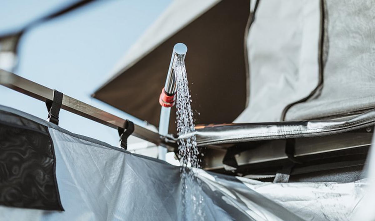 Eine Solar-Dusche ist ein schwarzer Sack, dessen Wasserinhalt sich per Sonneneinstrahlung erwärmt. Dieser wird am Fahrzeug aufgehängt und man kann darunter über einen kleinen Duschkopf duschen.. |