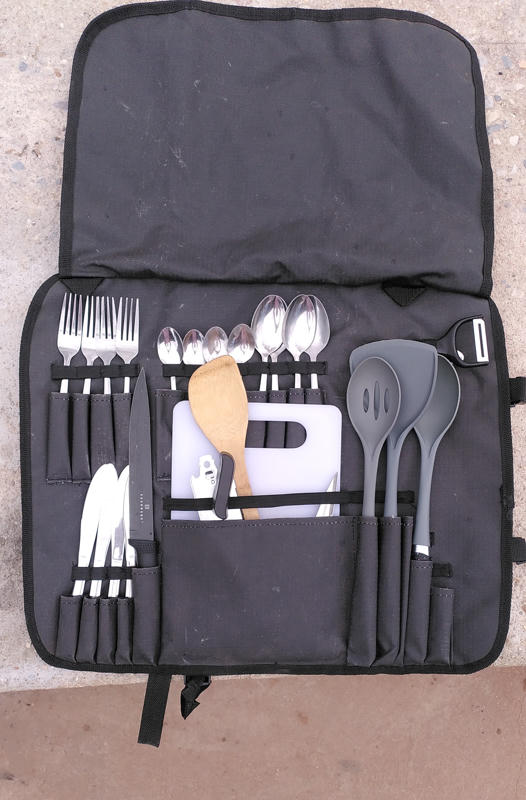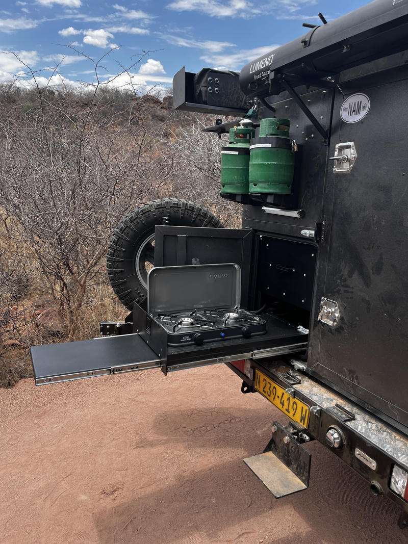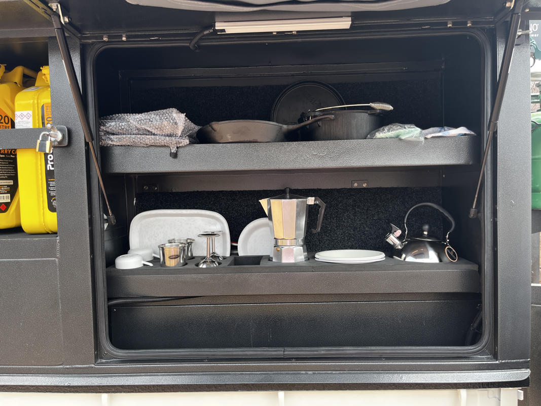 Im Heck befindet sich ausziehbarer 2-flammiger Gasherd. Das dazugehörige Koch- und Essgeschirr ist praktisch und leicht zugänglich an den Seiten verstaut. Außerdem befinden sich an beiden Seiten des Fahrzeugs jeweils eine 40l Kühlbox, beide von Außen und eine (auch) von Innen zugänglich.