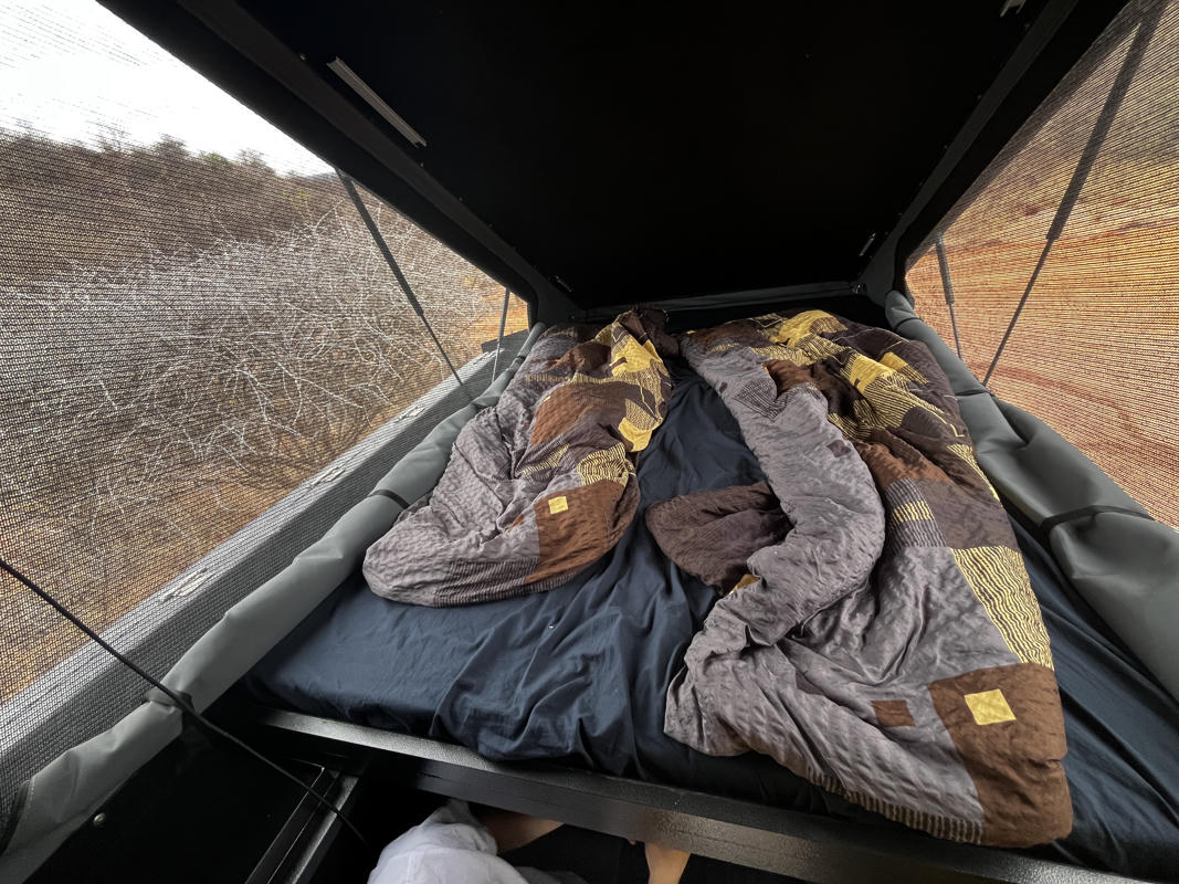 Für das geräumige Doppelbett (1,50m x 2,30m) muss das Dachzelt aufgeklappt werden. Der Group L Toyota Landcruiser 4x4 SC 2.8 Auto bietet hier den Vorteil, dass das Bett Bestandteil einer geschlossenen (wenn auch kleinen) Kabine ist. Diese Kabine beherbergt auch ein WC.