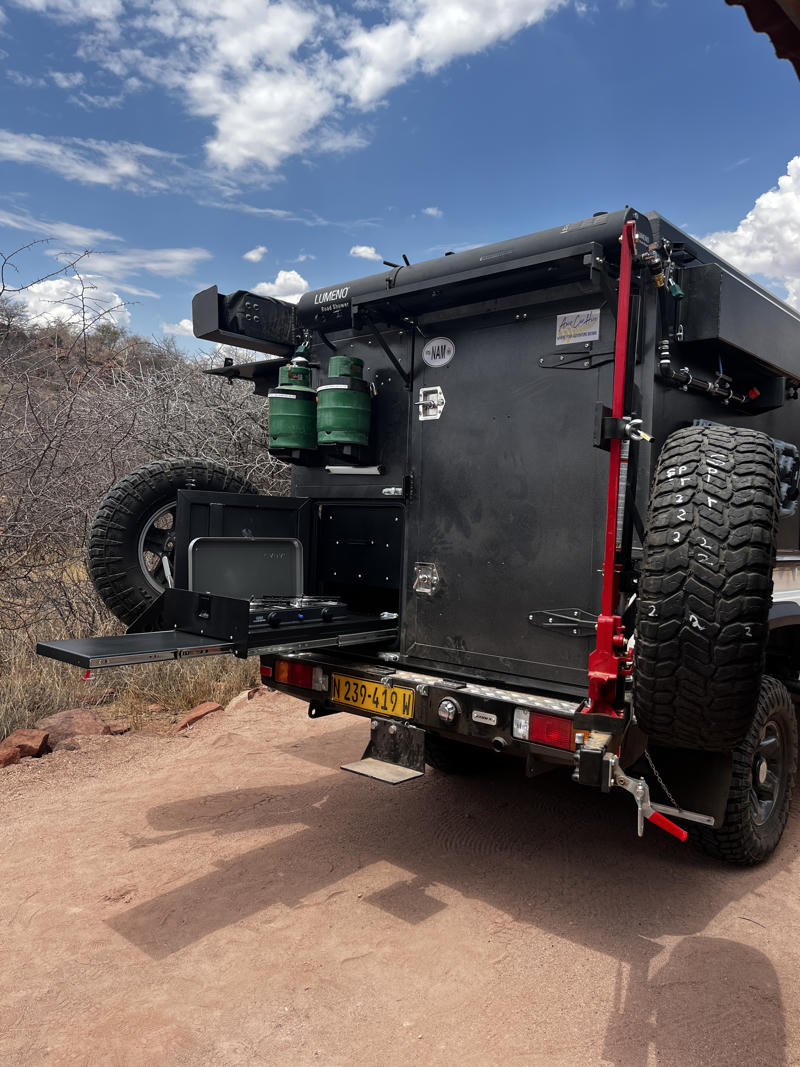 Daneben bietet der Group L Toyota Landcruiser 4x4 SC 2.8 Auto viele weitere Extra. So bietet die 270° Markise in der afrikanischen Hitze wohltuenden Schatten. Für den Außenbereich sind ebenfalls zwei Campingstühle sowie ein Campingtisch leicht zugänglich verstaut. Eine weitere Besonderheit stellt die Außendusche dar. Außerdem umfasst die Miete die klassische 4WD-Ausrüstung (z.B. Axt und Hi-Lift Jack).