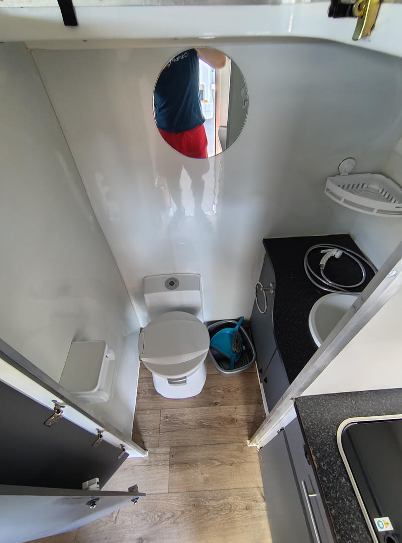 Zu den weiteren Annehmlichkeiten des Modells zählt ein breites Doppelbett (1,68x1,90m) inklusive Bettzeug sowie Handtüchern. Zudem hat der 4x4 NAVI 2 Berth eine Toilette an Board und eine Dusche mit Warmwasser für den Außenbereich. Außerdem bietet die Wohnkabine im Zweifelsfall einen ruhigen Rückzugsort, beispielsweise für die Zubereitung und Einnahme von Speisen. Denn der 4x4 NAVI 2 Berth hat neben einem 60l Frischwassertank auch einen 40l Kühlbox mit an Bord, welcher über eine 12V Dual-Batterie läuft.