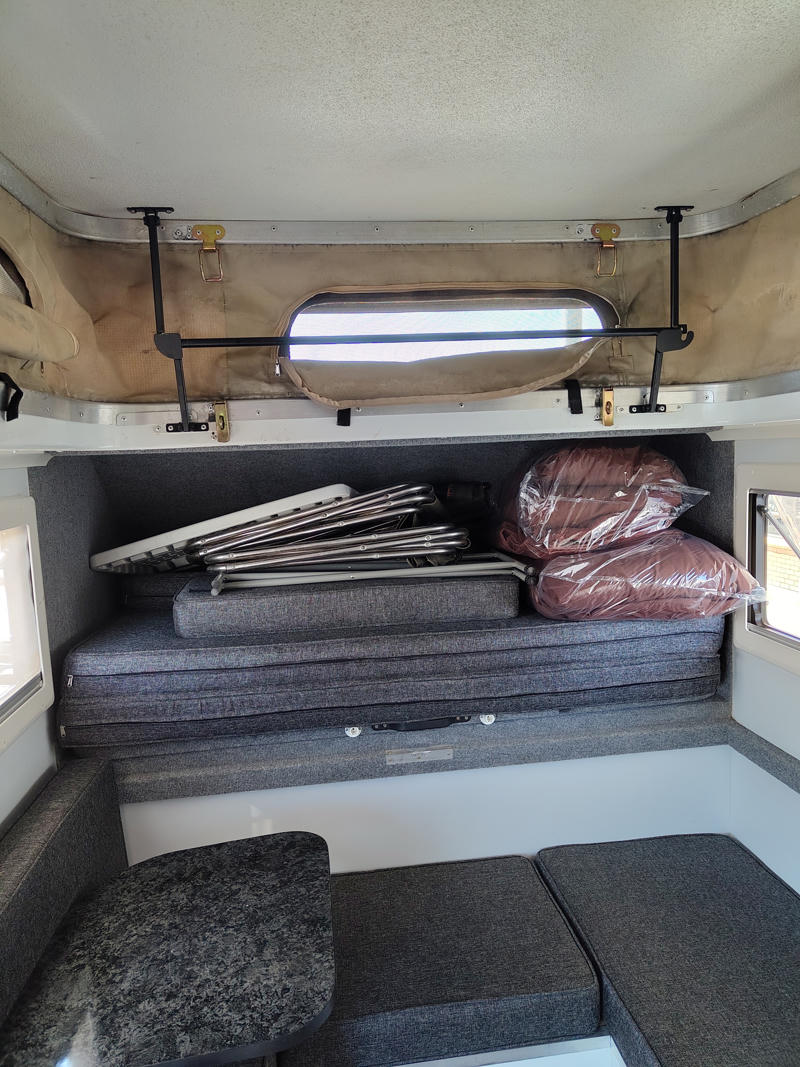 Die auf diesem Markt eher seltene Variante mit Wohnkabine bietet einige Vorzüge. Das Dachzelt kann senkrecht nach oben aufgeschoben und so der Innenraum (insbesondere in Kombination mit geöffneter Tür) gelüftet werden. Zudem erhöht sich die Innenhöhe der Wohnkabine bei aufgeschobenem Dachzelt von 1,80m auf 2,00m.
