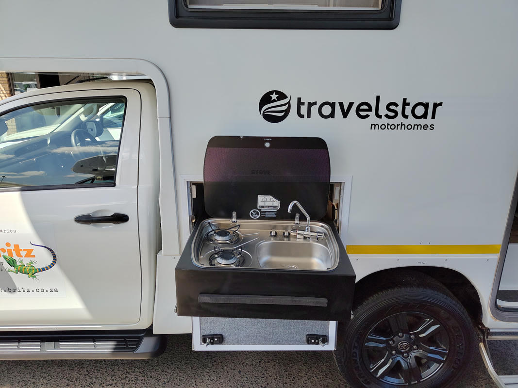Ein besonderer Pluspunkt sind die zwei Küchenzeilen. Denn der 4x4 NAVI 2 Berth bietet sowohl im Außenbereich als auch in der Kabine jeweils eine zweiflammige Herdplatte und eine Spüle. Somit kannst du bei gutem Wetter die faszinierende Natur genießen, während du dich bei schlechterem oder zu heißem Wetter ausweichen kannst.