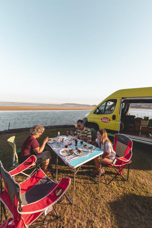 Der Happy 3 Ex von Happy Campers ist der perfekte Campervan für Familien oder Gruppen von bis zu 5 Personen. Basis des Campers ist ein Fiat Ducato (2017 oder älter) mit Dieselmotor, Frontantrieb und manueller Gangschaltung. In der Fahrerkabine befinden sich zwei Sitzplätze, weitere drei Reisende können auf der Sitzbank im Innenraum mitfahren.