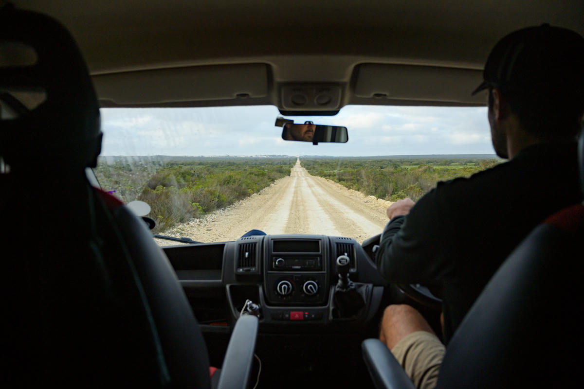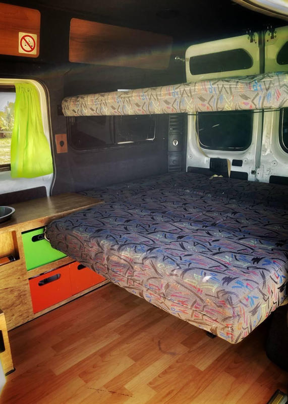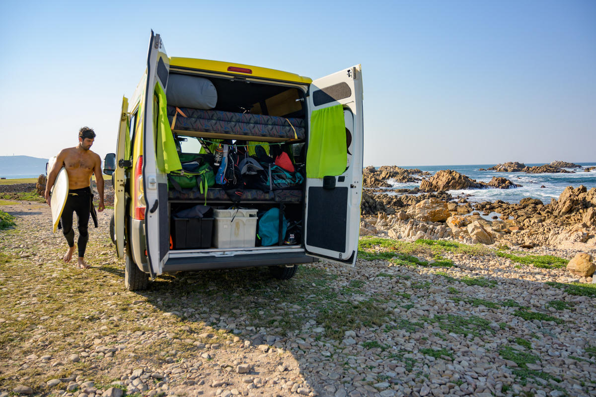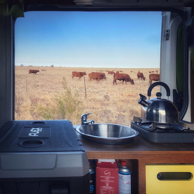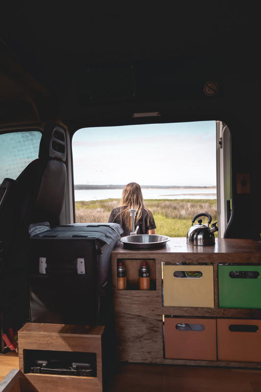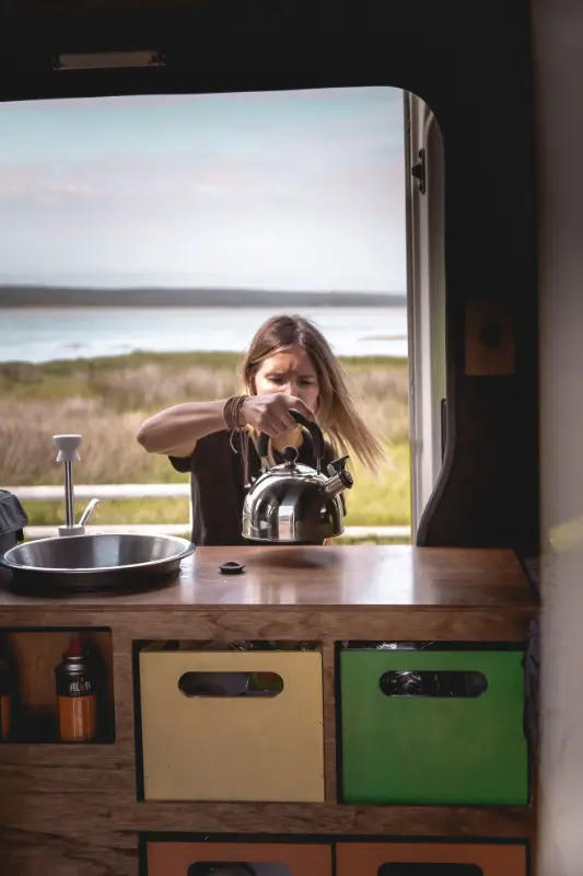 Direkt hinter der Fahrerkabine liegt die kompakte Küchenzeile mit vielen Staufächern. Das Waschbecken ist mit dem 20-Liter-Frischwassertank verbunden, zum Kochen dient der Gaskocher mit bis zu vier Kartuschen (reichend für 10–12 Tage). Ein 35L-Kühlschrank, und Lampen im Innenraum sowie der Kühlschrank laufen über die zweite Batterie im Wohnraum. Zusätzlich stehen Töpfe, Pfannen, Geschirr, Besteck, Vorhänge, Bettwäsche, Kissen und Decken zur Verfügung.