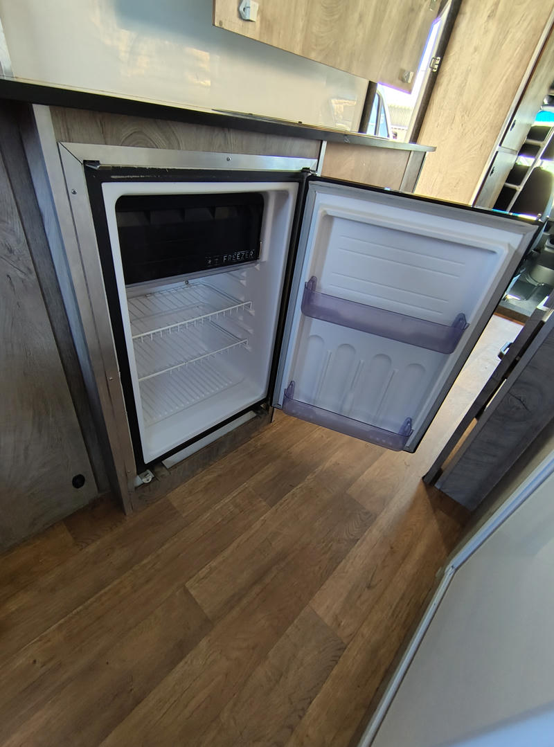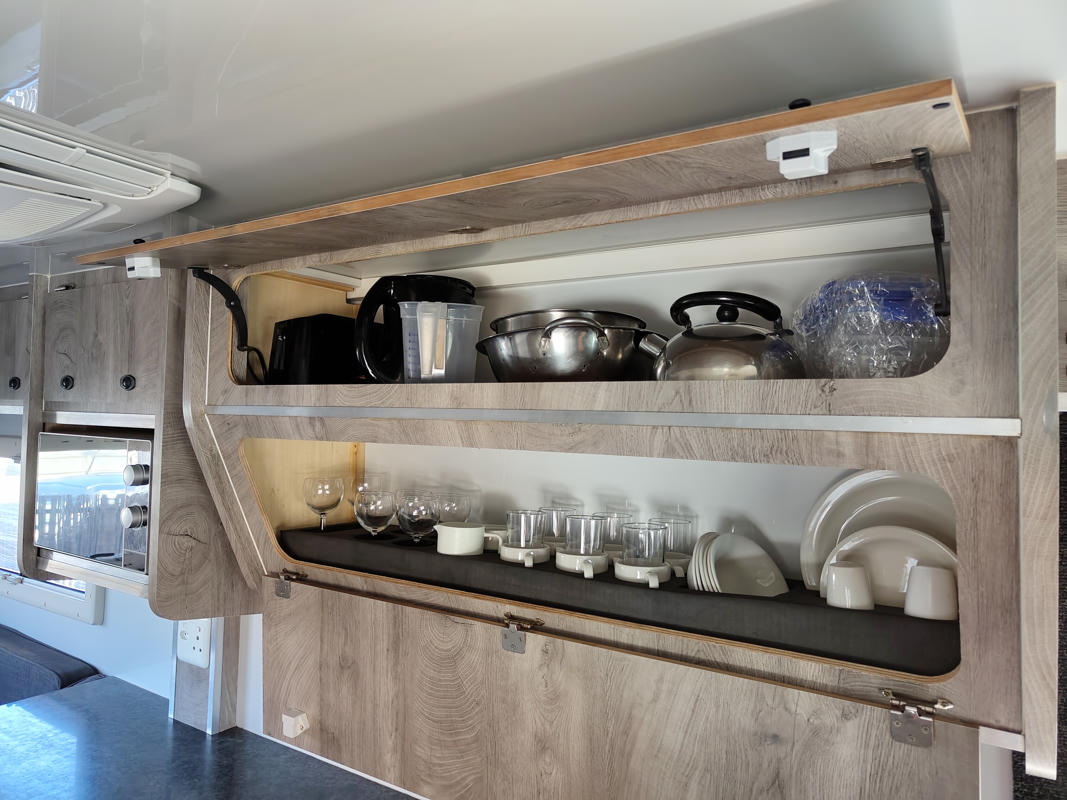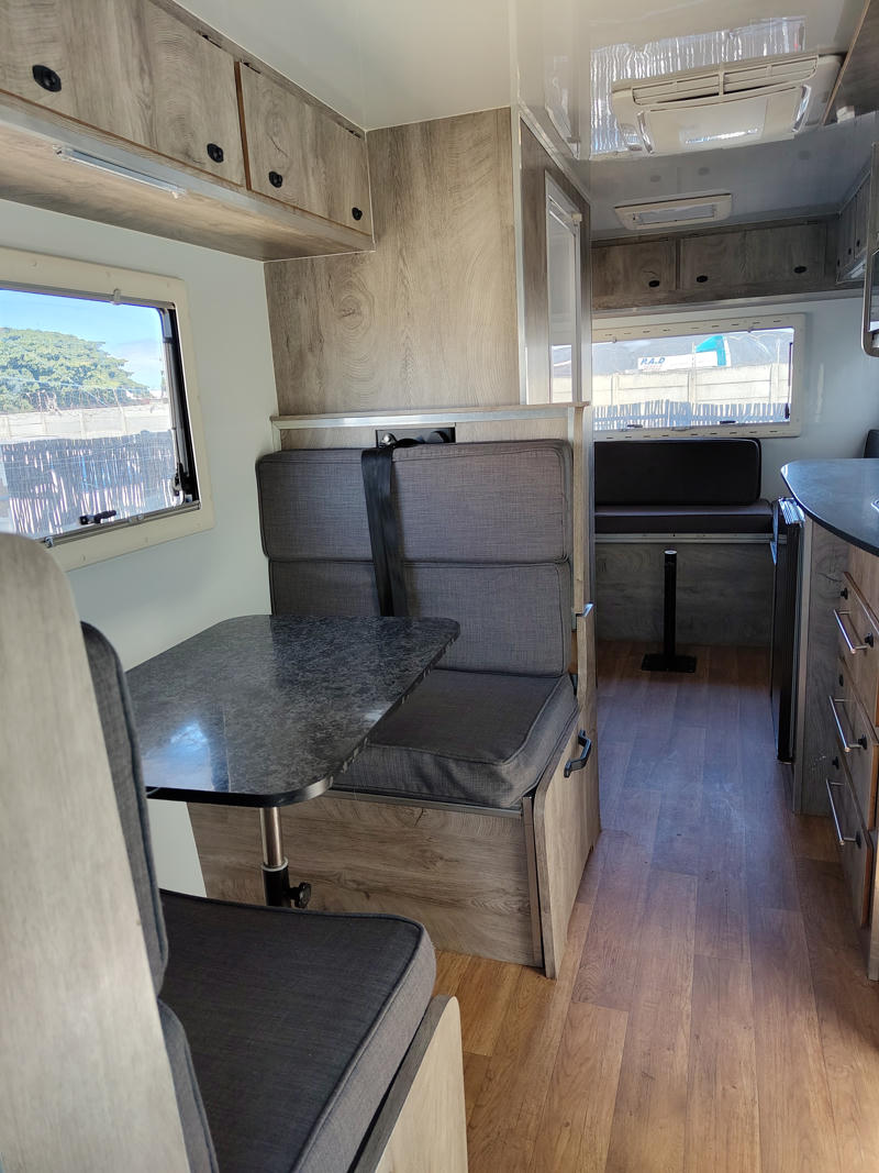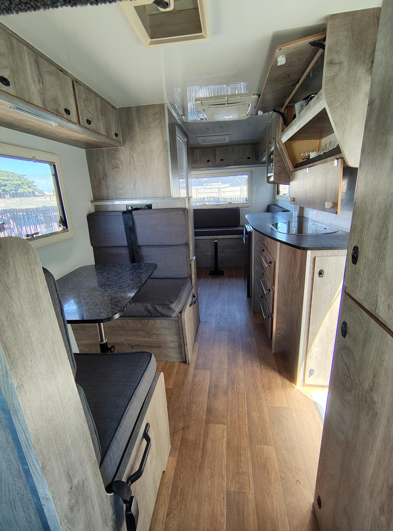 Die Küche des M4BI von Maui Motorhomes umfässt einen zweiflammige Gasherd, Spüle, Kühlschrank (ca. 80l), Arbeitsfläche und Schränke. Zudem sind standardmäßig Ess- und Kpchgeschirr mit an Board. Das kleine Bad ist mit Dusch, WC und Waschbecken vollständig ausgestattet. Darüber hinaus sind in die Wohnkabine zwei Sitzecken integriert. Davon befind sich die erste mittig und die zweite im Heck des Fahrzeugs.