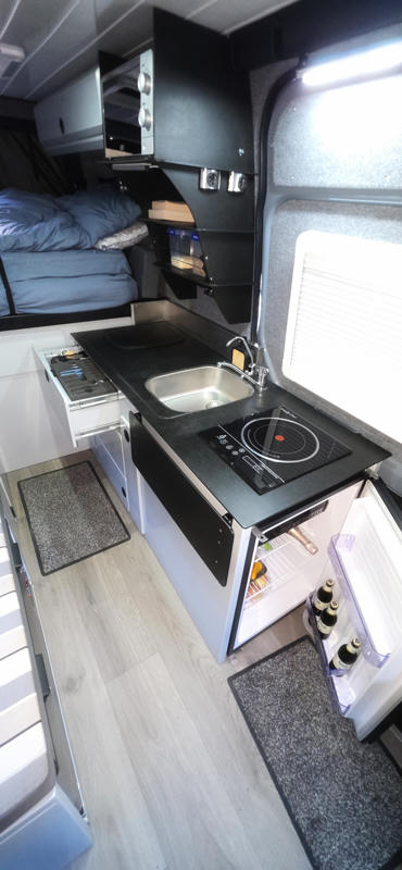 Im Inneren erwartet euch ein durchdachtes Raumkonzept für zwei Erwachsene. Das Doppelbett mit hochwertiger Bettwäsche sorgt für erholsame Nächte, während große Fenster und gute Belüftung ein angenehmes Raumklima schaffen. Die voll ausgestattete Küche verfügt über ein Induktionskochfeld, eine Mikrowelle sowie zwei separate Kühlgeräte, darunter ein 70-Liter Kühl-/Gefrierschrank und ein zusätzlicher 80-Liter Kühlschrank. Die Ausstattung wird durch einen 120-Liter-Frischwassertank mit Warmwasser ergänzt.