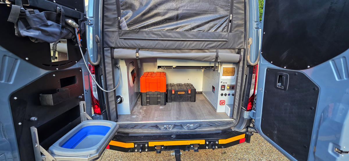 Abgerundet wird der Mercedes 4x4 Sprinter durch praktische Outdoor-Ausstattung wie Markise, Campingmöbel und Außenküche-Elemente, die das Leben draußen besonders angenehm machen.