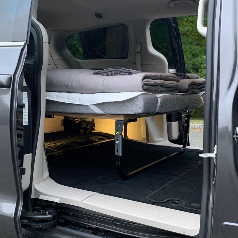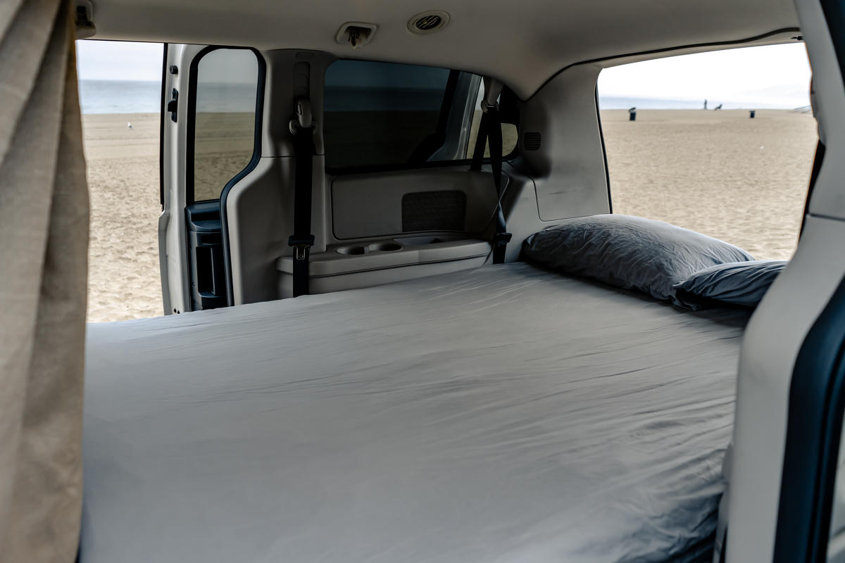 Das Doppelbett kann durch die hinteren Sitze aufgebaut werden mit Memory-Foam-Matratze, frischer Bettwäsche, Decke und zwei Kissen. Somit befinden sich im Heck insgesamt Schlafplätze für zwei Personen.