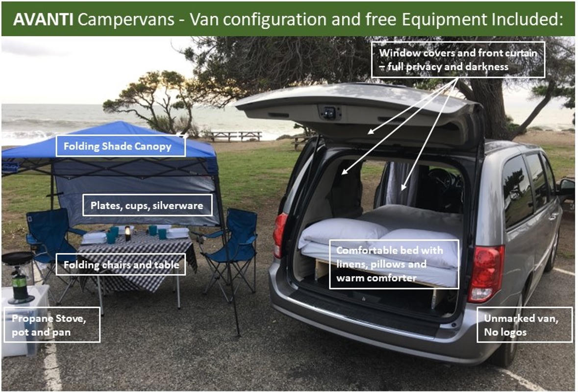 Der Caravan Campervan von Avanti Campervans kleiner Camper mit Doppelbett im Heck ideal für zwei Personen. Basis des Campers ist ein Dodge Grand Caravan aus dem Jahr 2018-2020 mit Automatikschaltung. Der Camper bietet Platz für 2 Personen zum Schlafen und 4 Personen zum Sitzen.