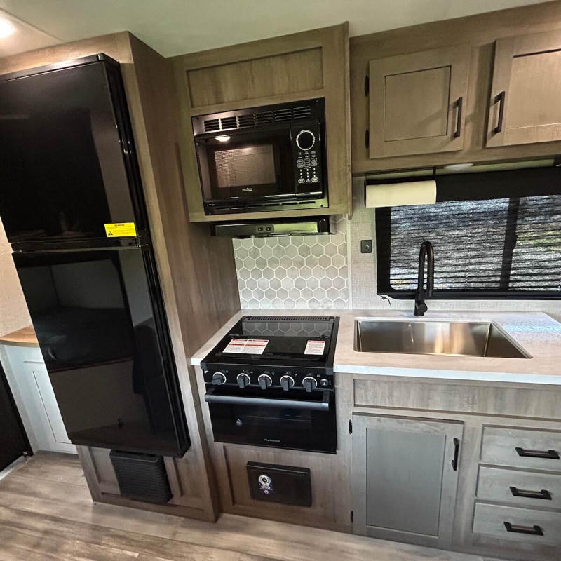 In der Küche befindet sich ein 3-flammiger Gasherd, eine Mikrowelle sowie ein Backofen. Die Lebensmittel können in den Stauräumen sowie im Kühlschrank mit Gefrierfach untergebracht werden.