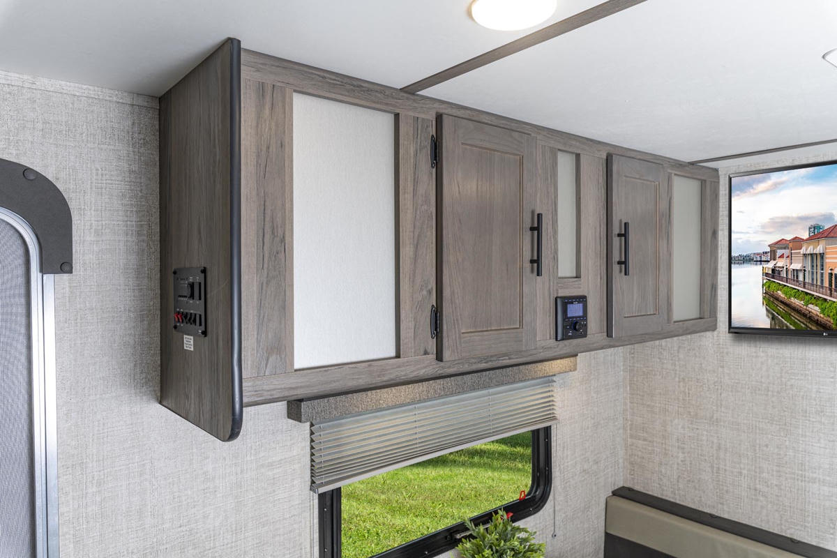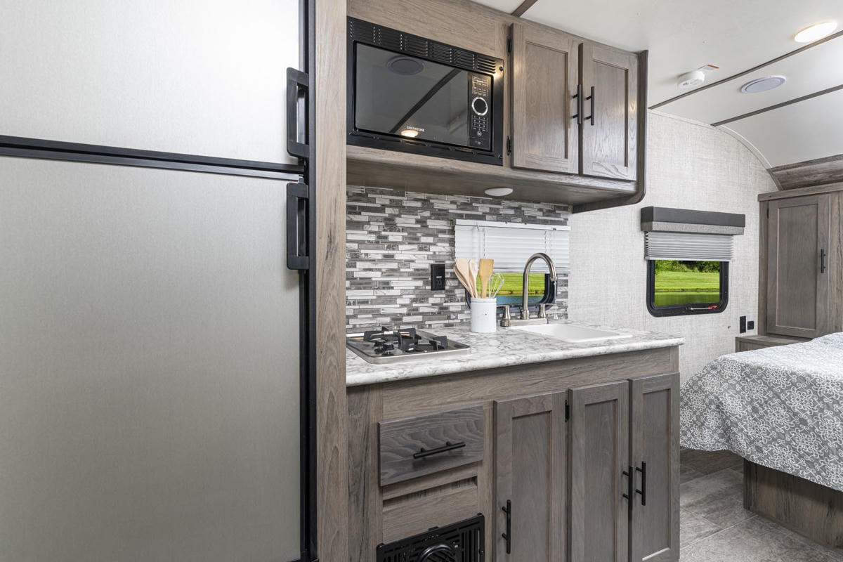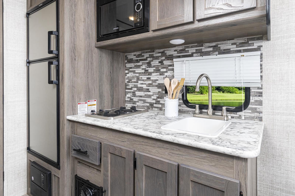 Die Küche ist mit einem großen Spülbecken, einem 2-flammigen Gasherd sowie einer Mikrowelle ausgestattet. In dem mit Propan-betriebenem Kühlschrank mit separatem Gefrierfach findet ihr genügend Platz für eure Lebensmittel. Zudem verfügt die Küche über ausreichend Arbeitsflächen und Stauraum. Gegenüber der Küche befindet sich eine Sitzecke mit Esstisch. Dort finden theoretisch bis zu 4 Personen Platz.