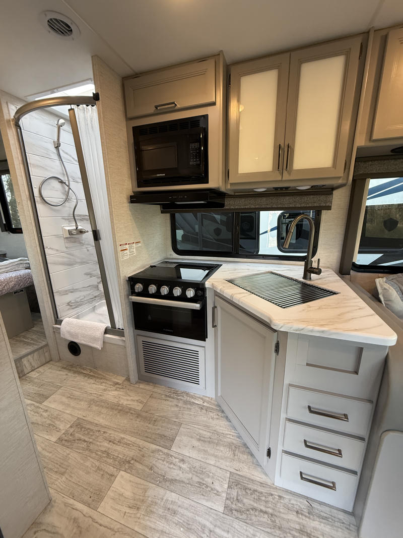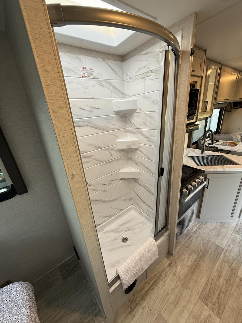Direkt dahinter befindet sich eine Eck-Küche, die über Gasherd, Mikrowelle mit Heißluftfunktion und einen großen Kühlschrank mit Gefrierfach. Hinter der Küche befindet sich das Badezimmer, das in diesem Fahrzeug zweigeteilt ist. Dusche und WC sind separat voneinander, können allerdings durch eine Trennwand vom restlichen Wohnbereich abgetrennt werden und somit miteinander verbunden werden.