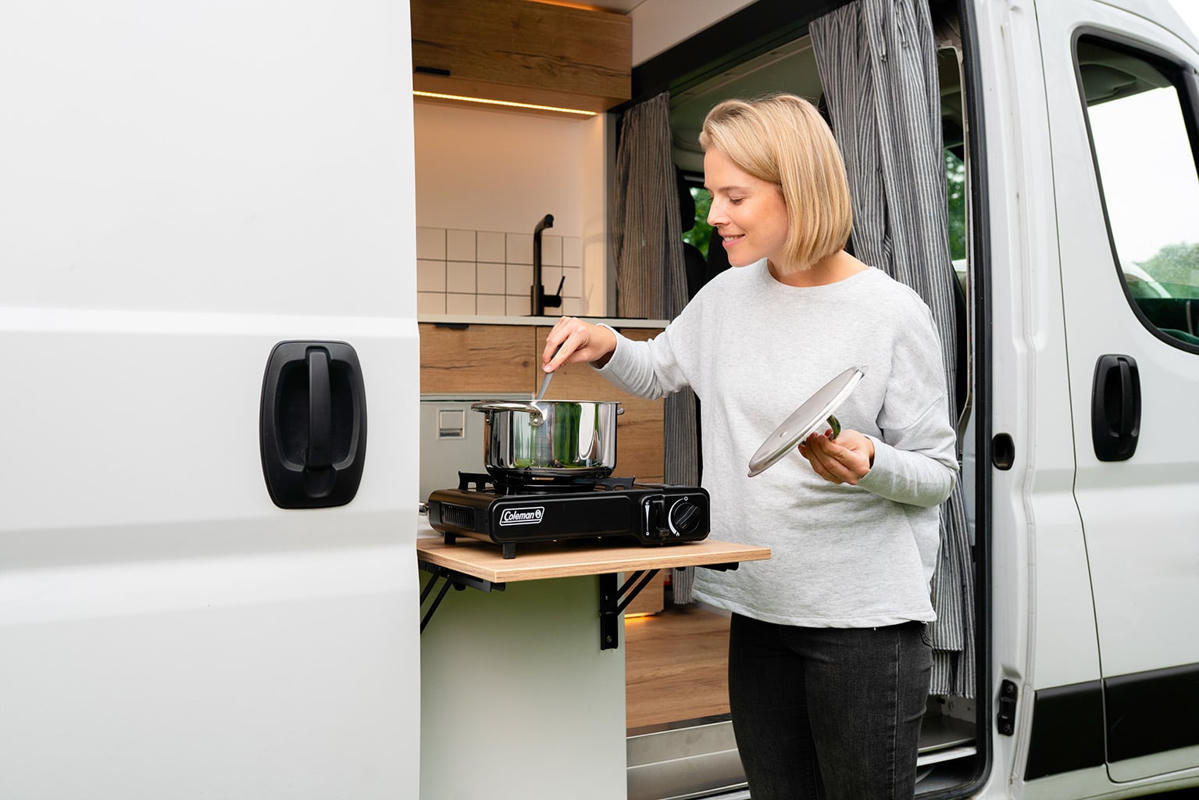 Der Van ist mit Kühlschrank, Spüle und einem Gasherd ausgestattet. Darüber hinaus verfügt der Biggie über eine komplett Küchenausstattung mitsamt Koch- und Essgeschirr.