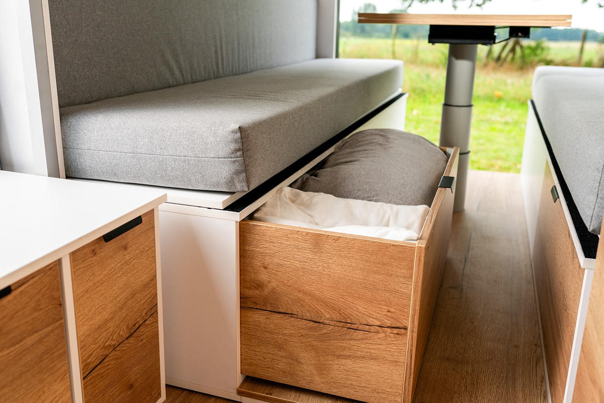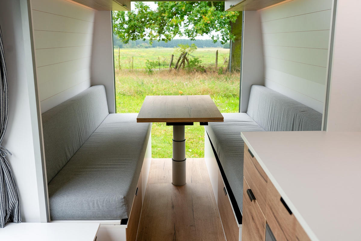 Im hinteren Bereich des Fahrzeuges befindet sich eine Sitzecke mit Tisch, die sich am Abend in ein Doppelbett umbauen lassen. Darunter befindet sich ausreichend Stauraum.