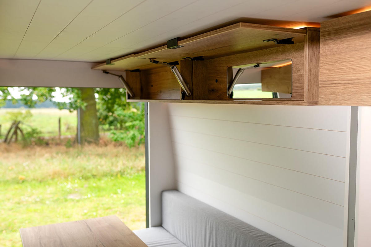 Zusätzlich verfügt der Camper über verschiedene Staufächer, einer Memory-Foam-Matratze, LED-Lichter sowie USB-Anschlüsse. Mit inkludiert sind zudem ein zusätzlicher Fahrer, Campingstühle und Tisch sowie ein Bluetooth-Lautsprecher.